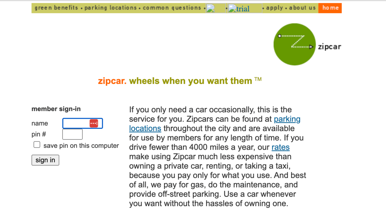 Zipcar’s official website circa 2000. Remember…there were no apps ;-).