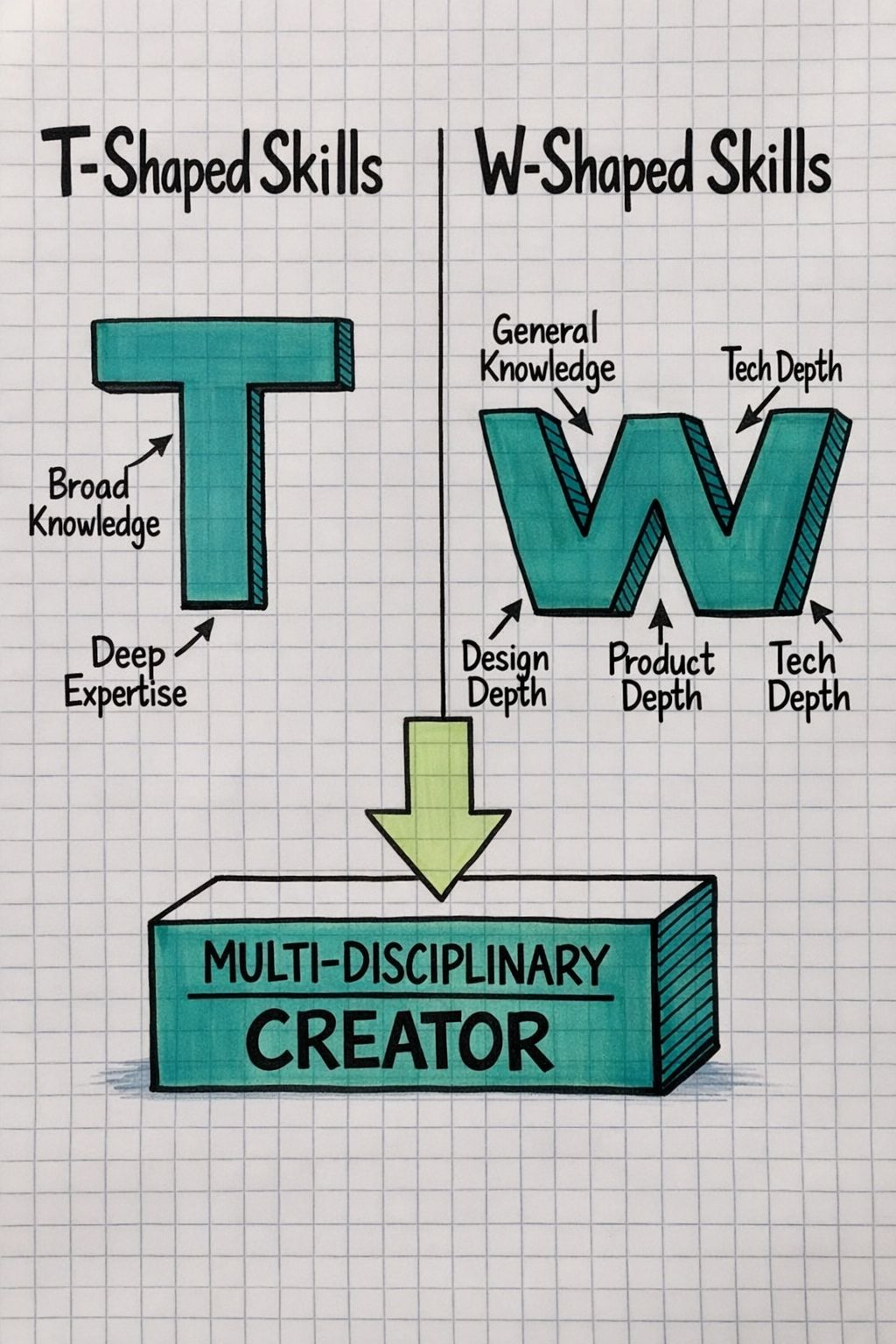 For years, the dominant career advice in design and tech was to become T-shaped: broad general knowledge with depth in one core discipline. In many respects, academia is designed to teach the same. Zooming out (and looking backwards), that model is optimized for large teams and stable boundaries between roles.