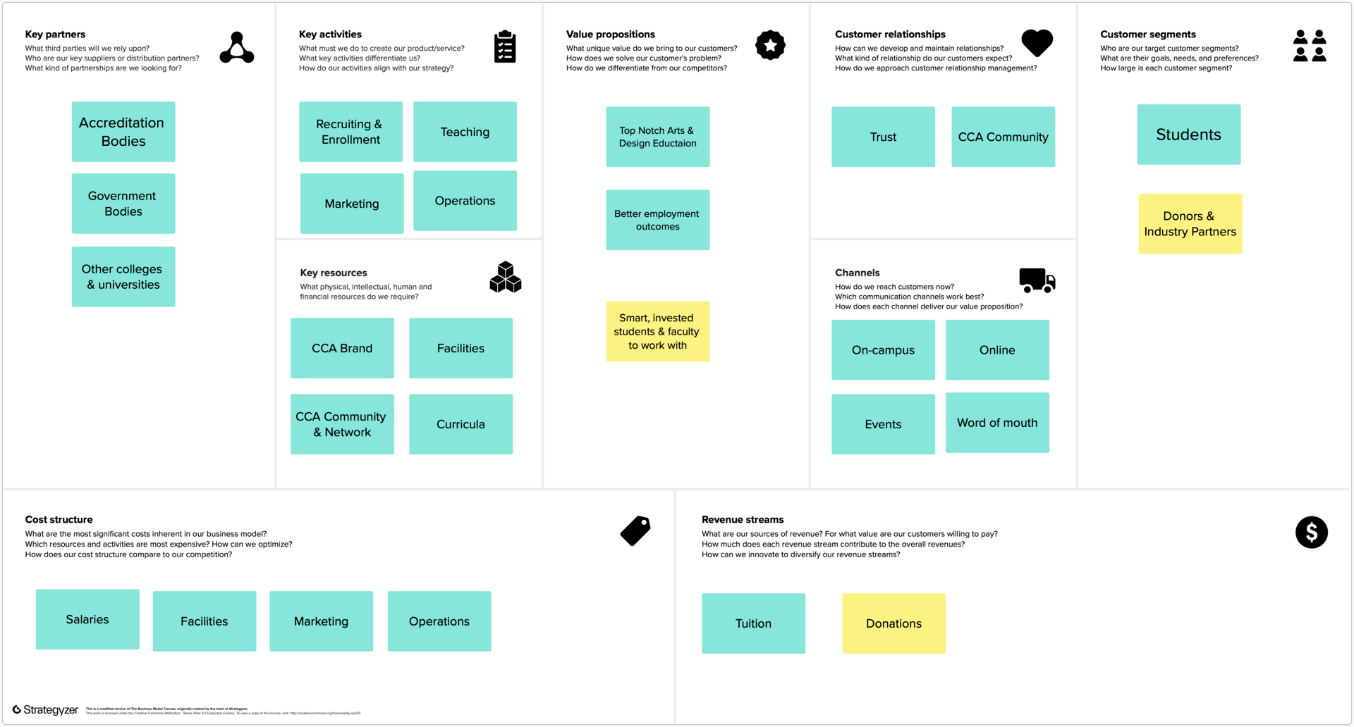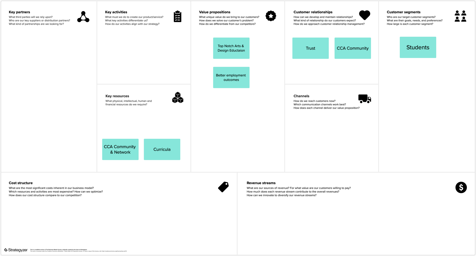 To me, this feels very much like the real-world version of a business model innovation technique called “epicenter innovation” I’ve used for a long time. Epicenter Innovation uses the tried and true Business Model Canvas to first plot out the current business model of any organization (even a dying one, like CCA’s). Then, using that business model, we remove elements and sometimes entire building blocks, forcing participants to co-create something wholly new from what’s left.