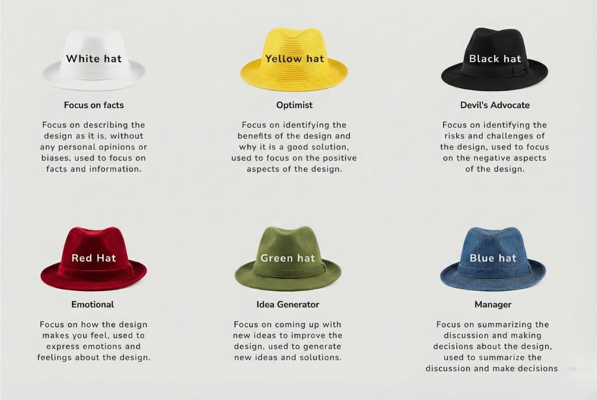 Together, they create a language any team can use to examine not just the work, but the thinking behind the work. The hats keep the conversation from relying on charisma, hierarchy, beautifully designed pitch decks, or whoever “has the best eye.” They turn critique into a shared method.