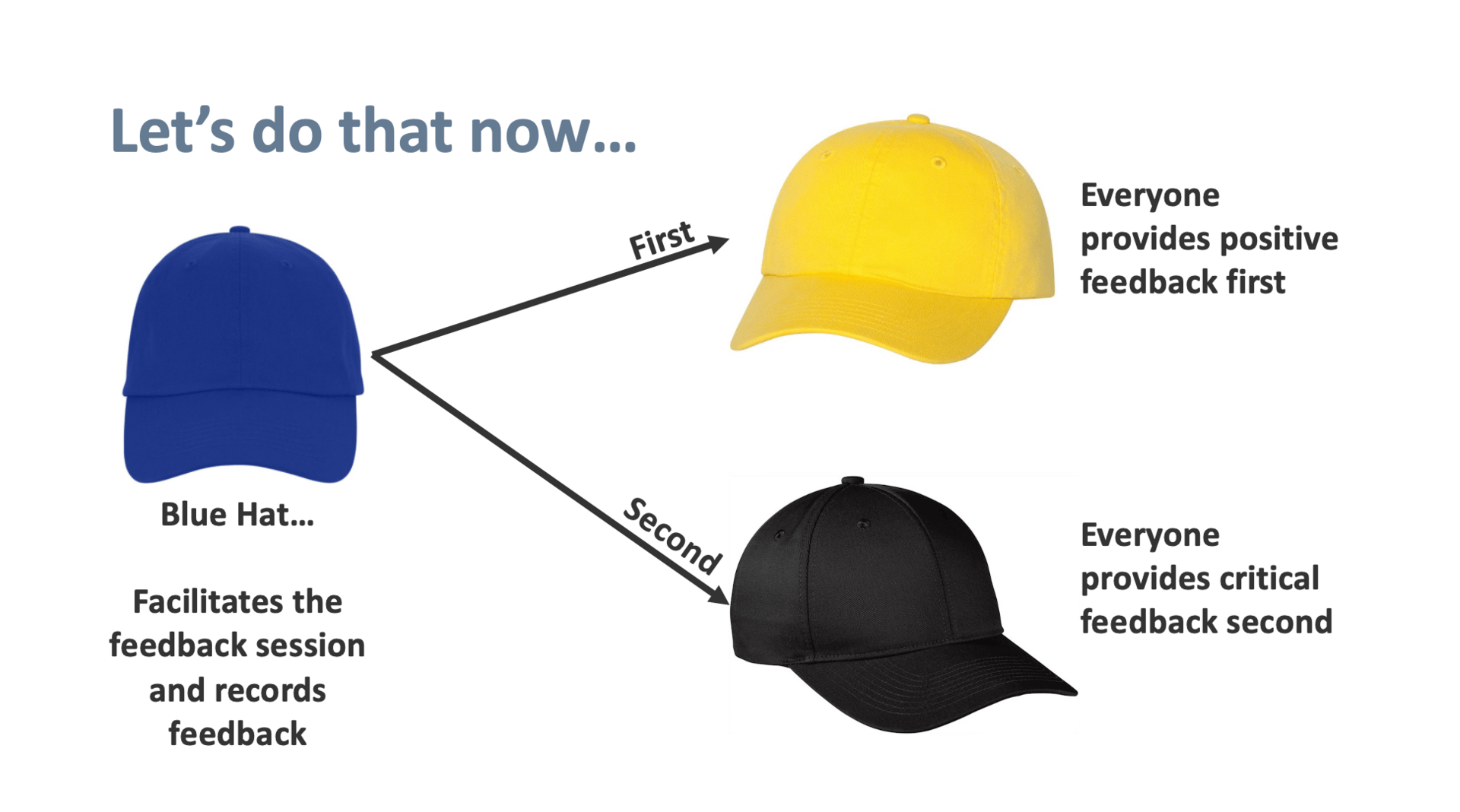 The Yellow Hat asks what’s working and why—forcing the articulation of strengths instead of only weaknesses.